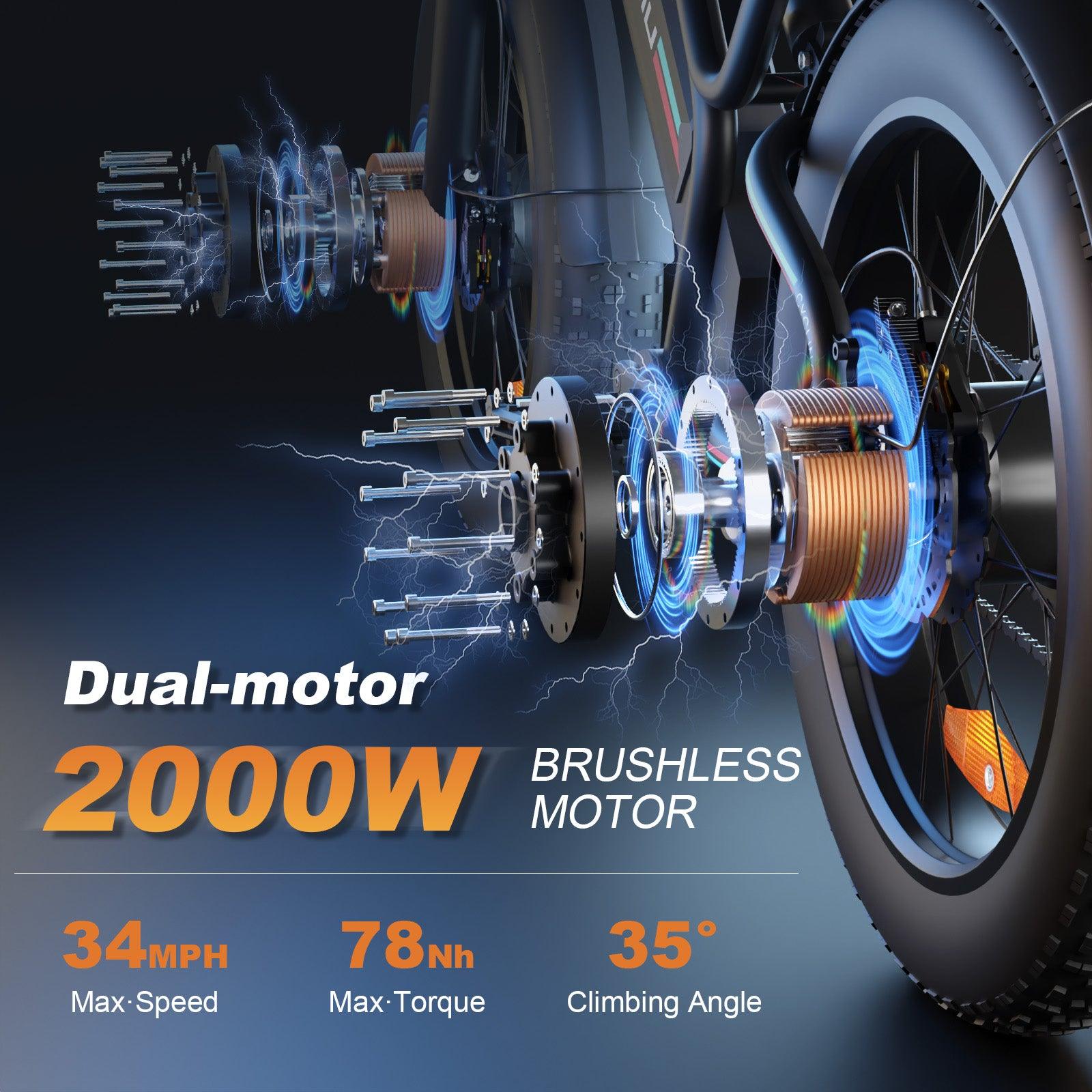 - [Powerful 2000W Dual Brushless Motors] Single and dual motor modes can be freely switched, with a maximum torque of 78 Nm, enhancing climbing performance and providing sufficient power for daily commuting. The top speed can reach 34mph, taking you to your destination quickly.