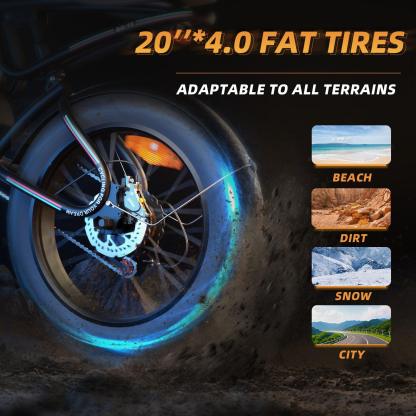 - [Fat Tires and Dual Hydraulic Disc Brakes] Conquer diverse terrains with the BG10's 20''x4'' fat tires, offering exceptional traction on beaches, snow, gravel, rain, mud, sand, and even ice. Navigate your ultimate e-bike adventure with confidence, backed by dual oil disc brakes that provide superior stopping power in all weather conditions, ensuring your safety at every turn.
