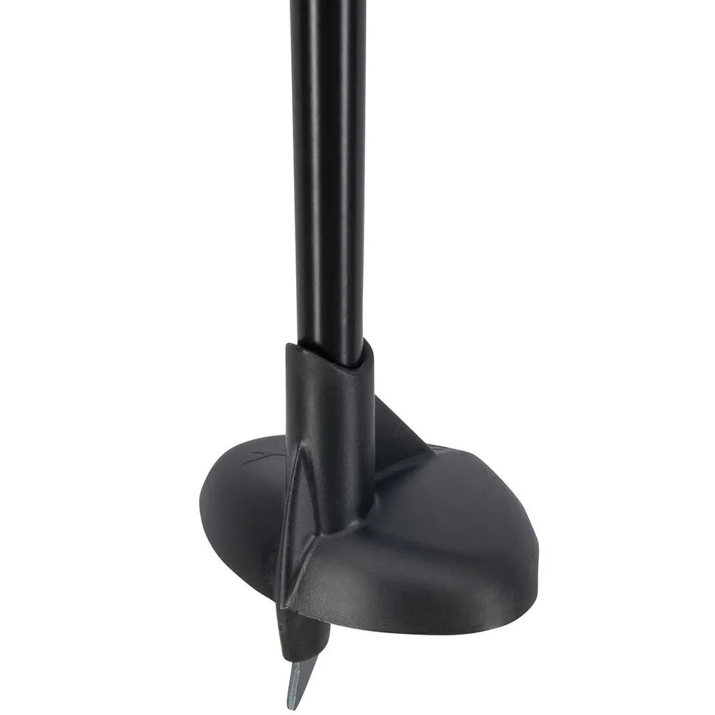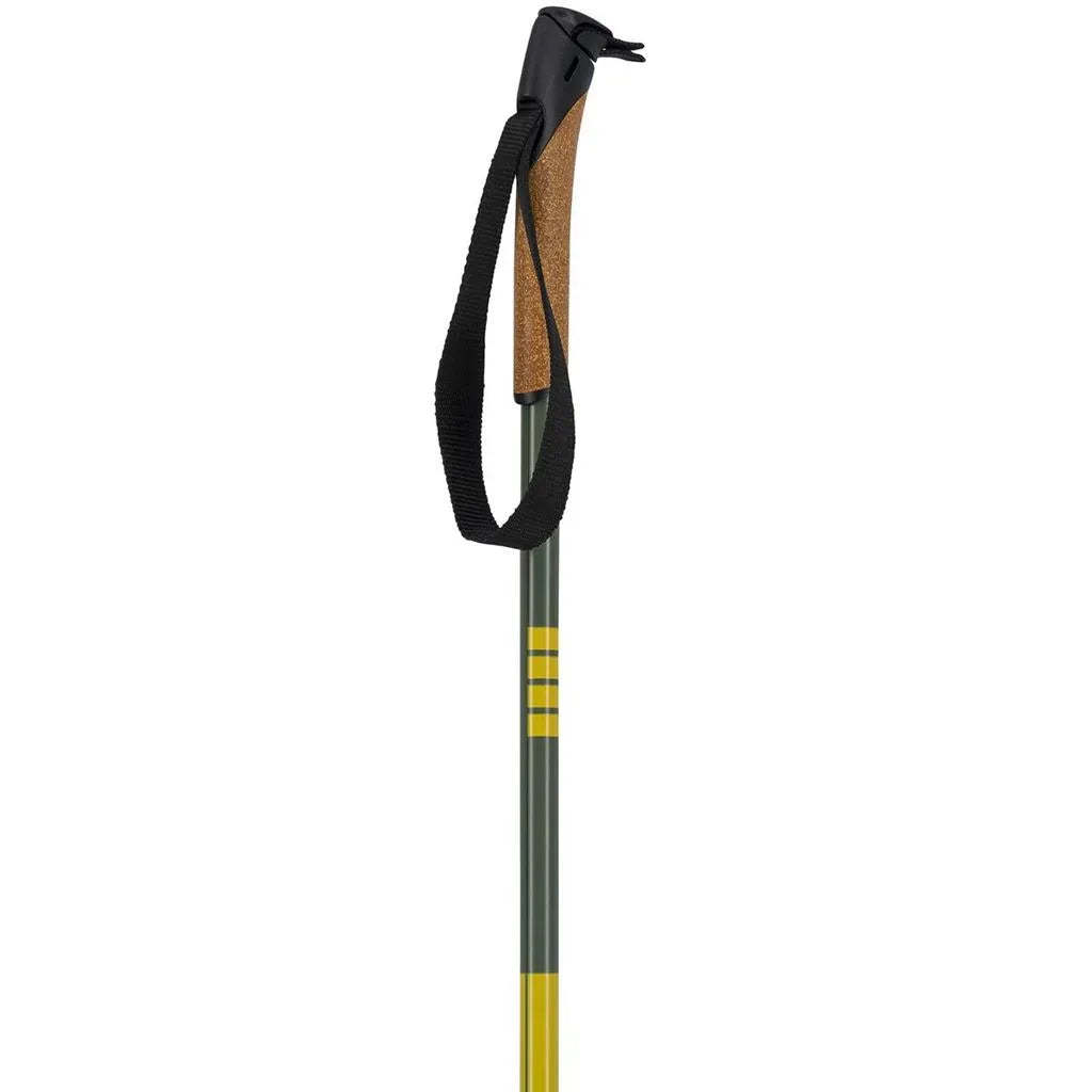 Conical aluminum pole with cork-filled urethane handle, shaped strap and large 97 racing basket.