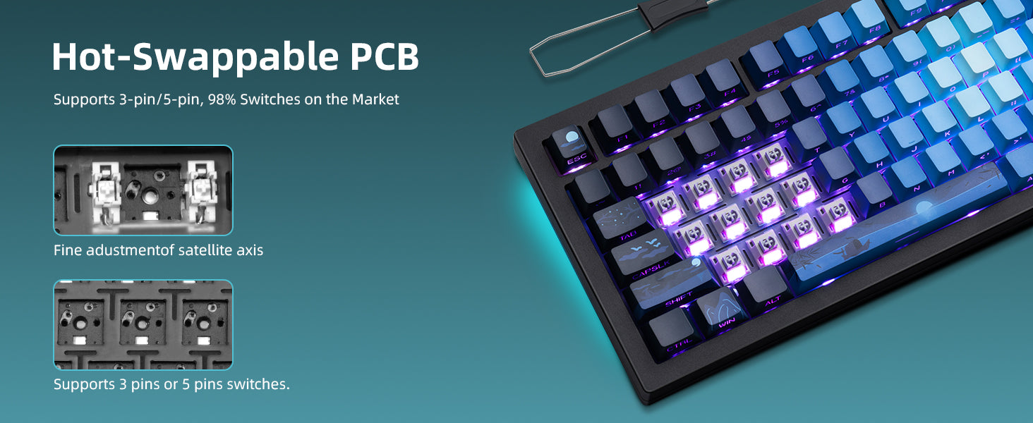 - 【Hot-Swappable & Fully Customizable】Compatible with both 3-pin and 5-pin mechanical switches, no soldering needed. With driver support, remap keys, set macros, and personalize lighting modes to fit your gaming or workflow style.