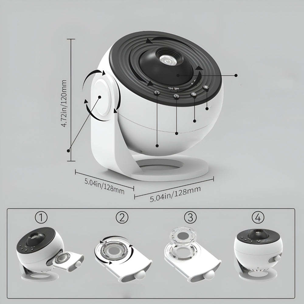 This Night Light turns any room into a calm sky scene using a bright Star Projector beam that displays planets, galaxies, and nebula patterns. The rotating lens creates wide Planetarium views across walls or ceilings, while the LED source keeps colors clear for bedtime, gaming setups, or study corners. This Room Decor piece measures 14.5 cm × 11.7 cm × 12.44 cm / 5.7 in × 4.6 in × 4.9 in, making the Decor easy to place on shelves or desks.